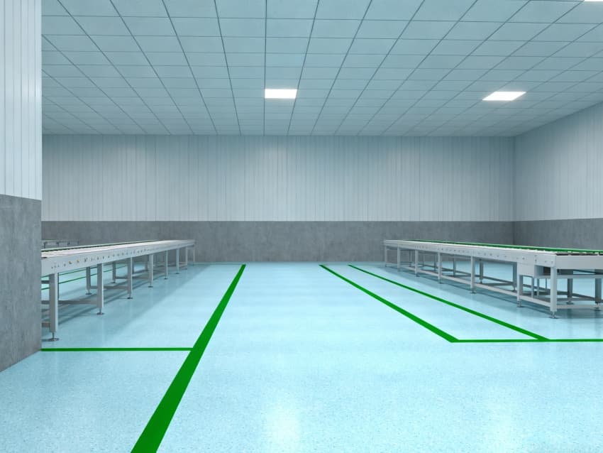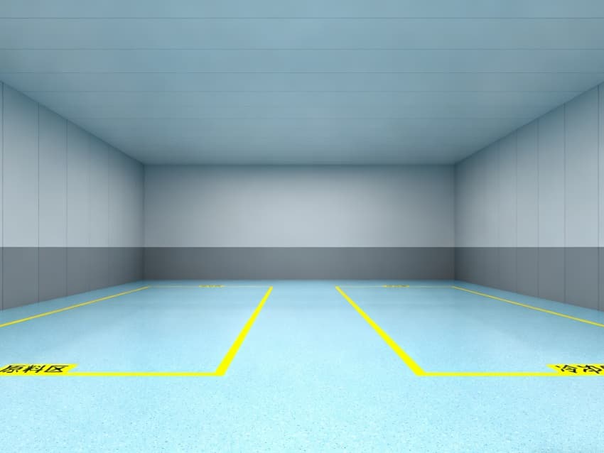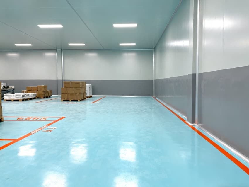 車間統(tǒng)一采用淺藍(lán)色耐磨環(huán)氧地面,兼具抗沖擊、易清潔特性,適配鈑金加工、總裝等多環(huán)節(jié)的設(shè)備安裝與物料轉(zhuǎn)運(yùn)需求;四周灰色防霉墻壁經(jīng)耐污處理,耐磨損且不易顯臟,配合頂部均勻布光系統(tǒng),營造明亮舒適的生產(chǎn)環(huán)境。?