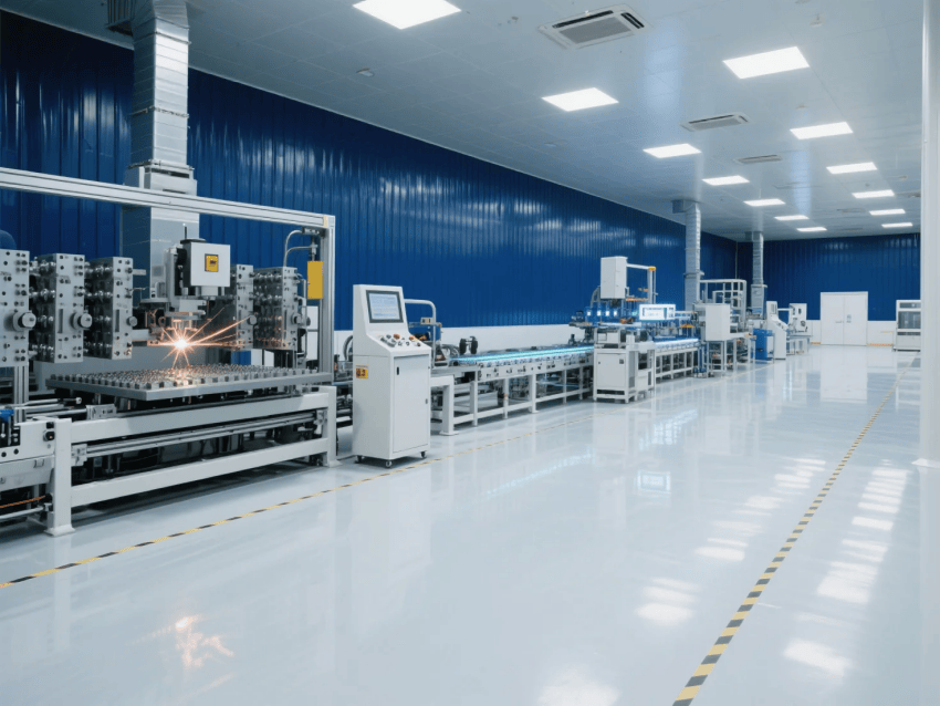 智能控制系統(tǒng)集成環(huán)境監(jiān)測(cè)、設(shè)備聯(lián)動(dòng)和MES數(shù)據(jù)看板,深藍(lán)墻面上嵌裝LED智能顯示屏,實(shí)時(shí)反饋生產(chǎn)數(shù)據(jù)。激光焊接區(qū)配備黃光防眩照明,工作站外圍設(shè)置淺灰環(huán)氧樹脂警示帶。整體設(shè)計(jì)通過冷色調(diào)的科技美學(xué)與自動(dòng)化產(chǎn)線的有機(jī)結(jié)合,構(gòu)建高效可靠的光伏材料智能制造空間。