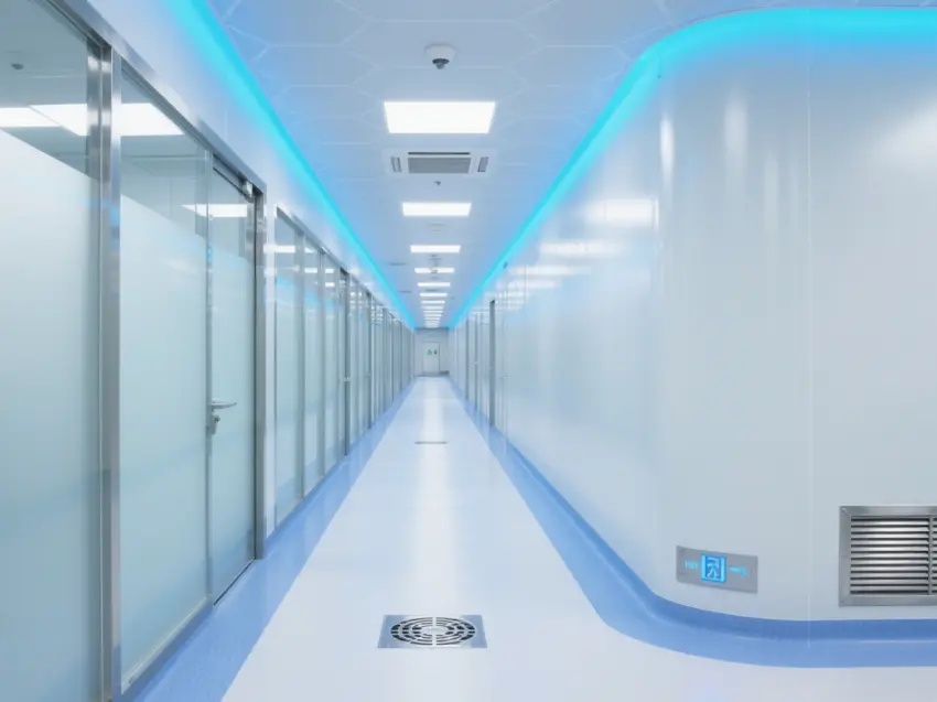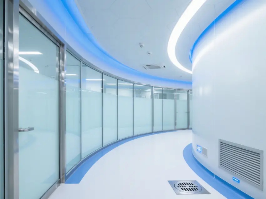 整個車間以白色為主色調(diào),搭配藍色的燈光裝飾,營造出一種干凈、專業(yè)且略帶科技感的氛圍。地面和墻面都采用了光滑的材質(zhì),便于清潔和保持衛(wèi)生。