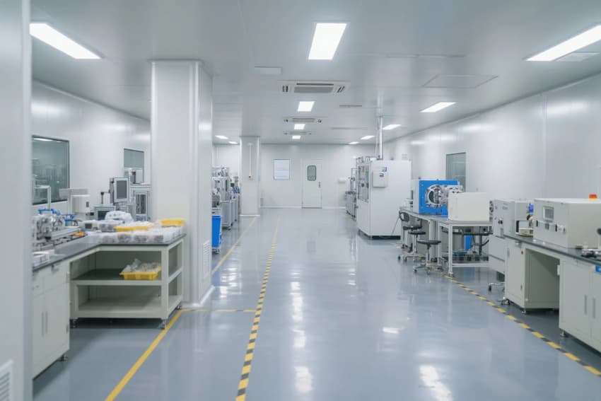 1000平方米電子無塵車間,現代科技風格,干凈整潔,光線明亮。核心生產區占70%,輔助區占20%,辦公區占10%。核心生產區:防靜電環氧地坪(淺灰色),白色彩鋼板墻面和天花板,垂