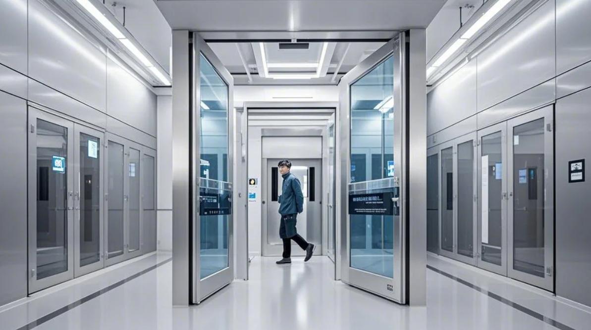 半導體晶圓廠潔凈車間,工業級無塵環境設計。更衣區設置環氧樹脂自流平地坪,墻面嵌入正壓送風百葉,紫外線消毒衣柜線性排列。風淋通道配備360度旋轉氣流噴嘴,頂部