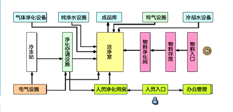 LED/液晶/線路板潔凈無(wú)塵室除了要完成上述的功能、目的外,因?yàn)橹圃爝^程中工藝生產(chǎn)設(shè)備都是在潔凈無(wú)塵室內(nèi)操作的,以供生產(chǎn)工藝機(jī)臺(tái)使用,潔凈無(wú)塵室與各系統(tǒng)關(guān)系如下: