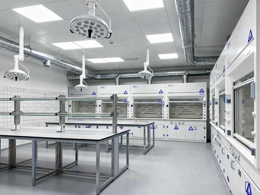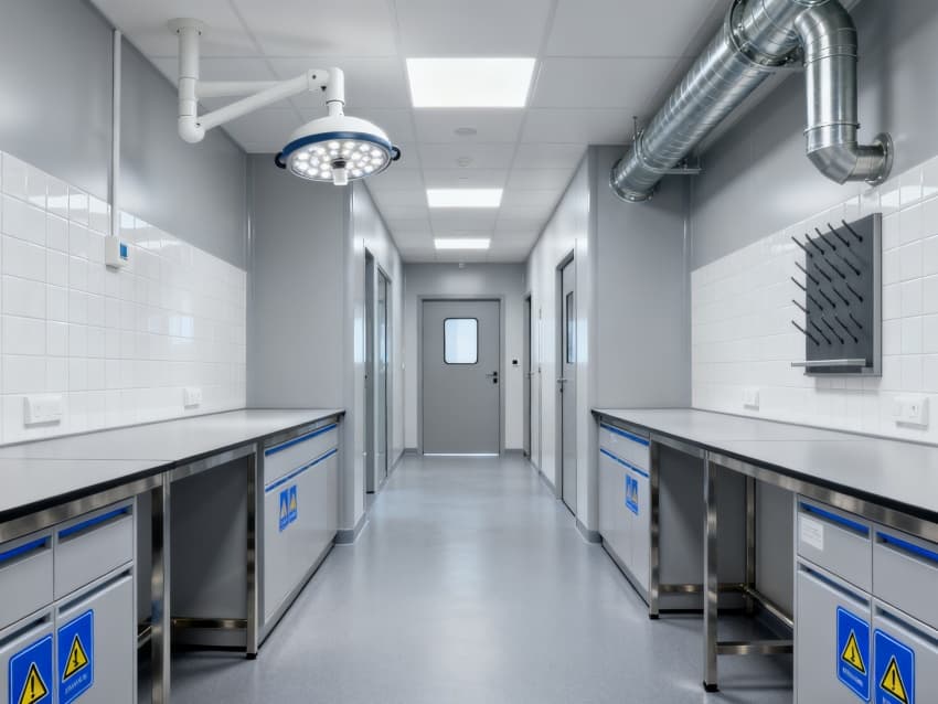 本生化研究實驗室凈化工程嚴格遵循ISO7級潔凈標準,將實驗空間科學劃分為四大核心功能區(qū)域:樣品前處理區(qū)配備通風櫥、震蕩儀等預處理設備,采用負壓設計防止交叉污染;試劑配制區(qū)設有獨立的天平室與超純水系統(tǒng),通過溫濕度智能調控系統(tǒng)將環(huán)境參數穩(wěn)定控制在±1℃與45%-60%RH;精密檢測區(qū)配置防震臺與電磁屏蔽裝置,可滿足高效液相色譜、質譜儀等精密儀器的運行需求;無菌操作區(qū)配備層流凈化工作臺與生物安全柜,配合動態(tài)浮游菌監(jiān)測系統(tǒng),確保實驗環(huán)境達到百級潔凈度標準。各功能區(qū)通過氣密式緩沖間與機械互鎖傳遞窗形成物理隔離,構建起三級防護屏障。在保障蛋白質分離純化、核酸提取擴增等常規(guī)實驗高效開展的同時,還專門設計了酶活性檢測專用恒溫恒濕實驗室,采用獨立的凈化空調系統(tǒng)與UPS不間斷電源,可支持對環(huán)境參數高度敏感的高精度研究項目。此外,工程特別設置雙通道應急處理系統(tǒng),包含緊急洗眼裝置、消防噴淋系統(tǒng)與防化物資儲備間,配合逃生路線熒光標識與應急照明系統(tǒng),全方位保障實驗人員安全與科研數據完整。?