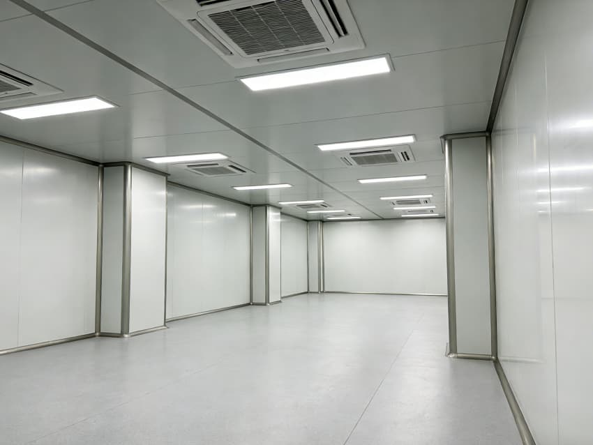 本次呈現(xiàn)的電子精密器件工廠車間以“高精度施工、高潔凈適配”為核心,融合多項專業(yè)施工工藝,車間內(nèi)部施工工藝凸顯精密特性:地面采用淺灰色環(huán)氧防靜電自流平工藝,經(jīng)基層拋丸處理、界面劑涂刷、環(huán)氧砂漿找平、自流平罩面四道核心工序,表面平整度誤差≤0.8mm/m,防靜電性能達10?-10?Ω;墻面采用白色潔凈抗菌涂層施工,推行無縫拼接技術(shù),陰陽角采用R50圓弧倒角工藝,杜絕積塵死角,涂層硬度達2H以上,耐受頻繁清潔。