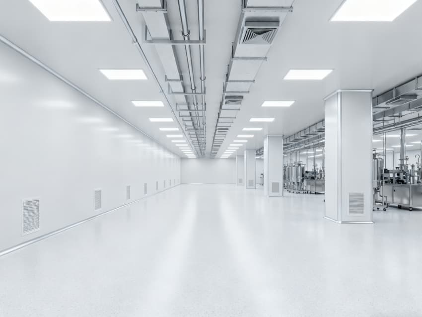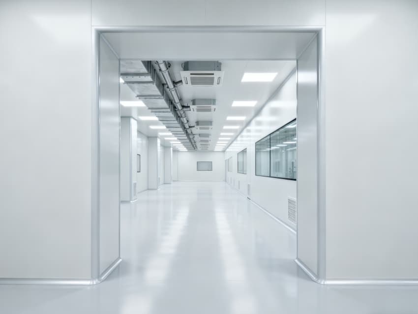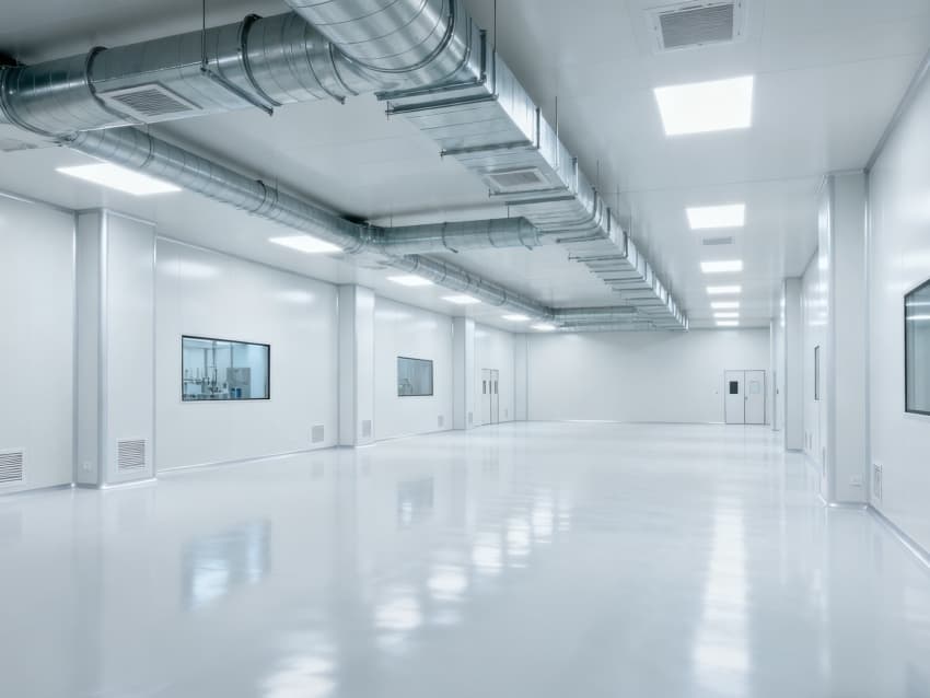 內(nèi)部6個核心生產(chǎn)車間均為無設(shè)備空曠布局,按萬級潔凈標準打造:地面鋪設(shè)無縫環(huán)氧自流平,墻面采用食品級不銹鋼墻板,陰陽角做圓弧處理,杜絕積塵死角;空間柱網(wǎng)間距均勻,預(yù)留充足設(shè)備安裝點位與運維通道,滿足后續(xù)柔性生產(chǎn)需求;頂部吊頂整合新風系統(tǒng)與防眩光照明模塊,風口布局對稱規(guī)整,進一步強化空間的空曠感與規(guī)整性,為生物制藥生產(chǎn)的潔凈性、安全性與可擴展性奠定堅實基礎(chǔ)。