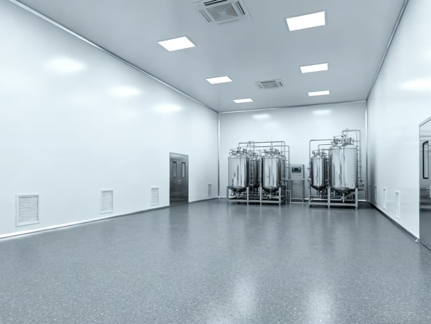 設計在環境適配性上針對性突出:地面采用灰色耐濕熱環氧自流平材質,其特殊配方經121℃高溫滅菌循環測試后硬度無衰減,表面粗糙度Ra≤0.8μm,配合無縫拼接工藝形成連續抗菌屏障,有效阻斷芽孢桿菌等頑固微生物的滋生路徑;四周白色抗菌墻壁選用食品級納米涂層,該涂層經第三方檢測機構驗證,對金黃色葡萄球菌抑菌率達99.9%,配合R≥50mm的圓弧墻角與全密封模塊化吊頂,徹底消除傳統直角結構的積塵隱患。車間頂部集成三級過濾生物安全型層流系統,通過初效、中效、高效過濾器的梯度攔截,配合FFU風機過濾單元實現垂直單向流,可穩定維持ISO7級(萬級)潔凈度,局部配置百級層流罩形成隔離操作區,確保關鍵工序在無菌環境下進行。此外,墻面還預埋了智能溫濕度傳感器陣列,通過物聯網系統實時監控并調節溫濕度參數,為發酵菌種提供最適宜的生長環境。