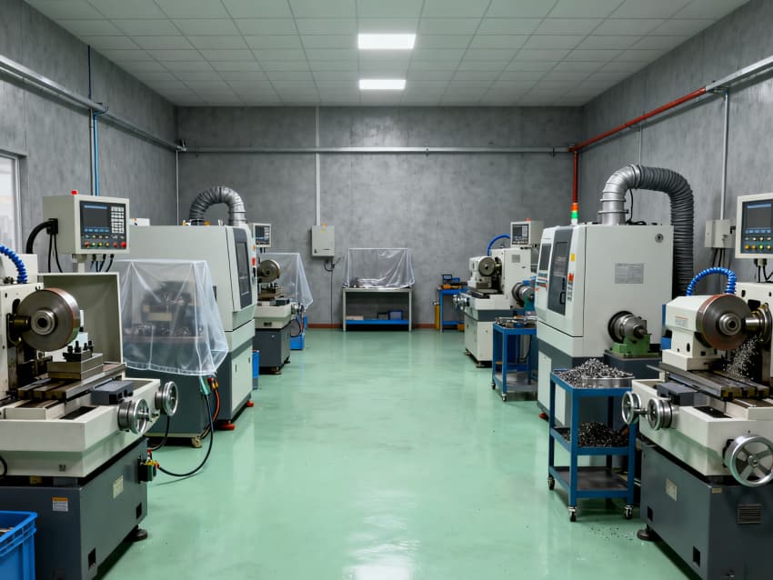 本精密CNC加工廠房涵蓋8個核心功能車間,整體風格沉穩專業,統一采用淺綠色耐磨防滑地坪與灰色工業級耐磨墻面,精準適配精密零件銑削、車削、鉆孔等CNC加工全流程需求。淺綠色地面選用高硬度環氧材質,抗壓耐磨且具備一定減震性,可減少設備運行震動對加工精度的影響,同時便于清理金屬碎屑與切削液殘留;灰色墻面采用防刮耐磨涂層,耐油污易擦拭,搭配工業風照明系統,營造清晰且抗視覺疲勞的操作環境。