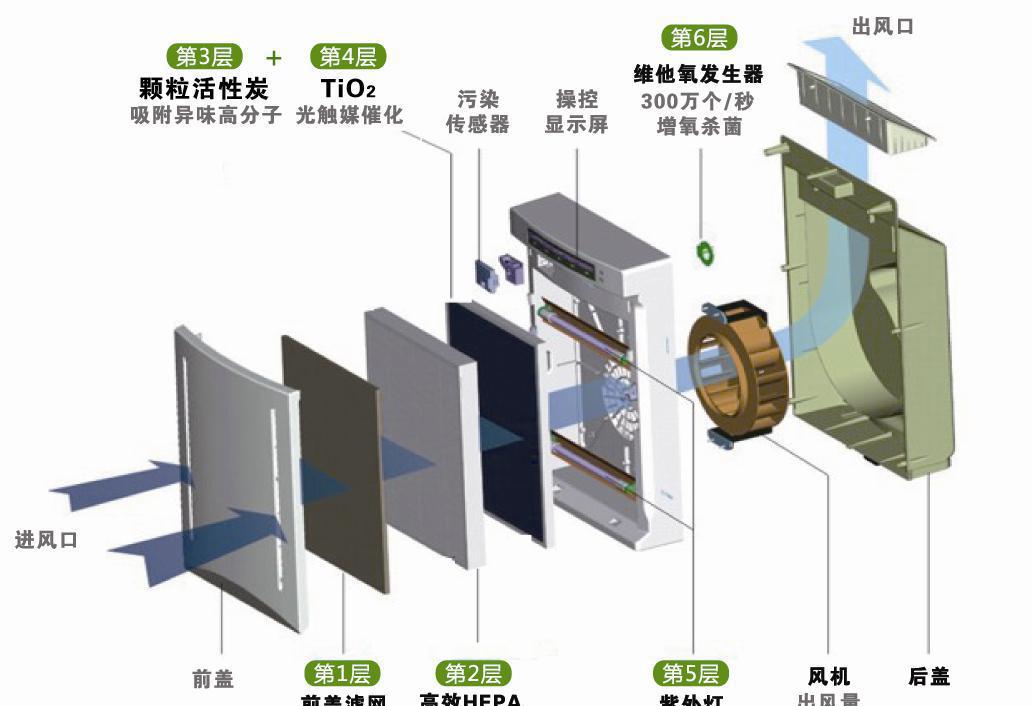 A、空氣凈化器:只能吸附空氣中灰塵等顆粒物,無法消除有害分子,即使反復處理,效果依然很差。