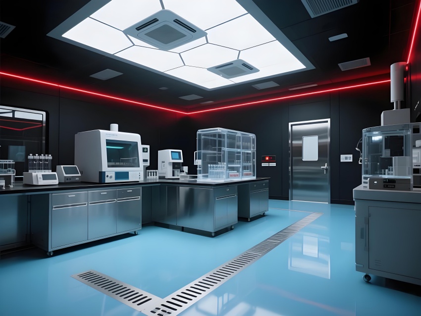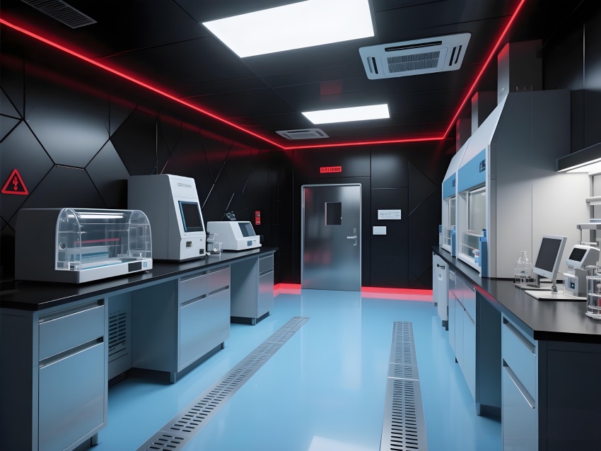 本實驗室采用"生物防御未來主義"風格,通過銳利的幾何切割與警示色彩構建科研防護美學。核心實驗區以啞光黑墻面搭配紅色應急光帶,形成視覺危險預警,與清潔區的冰藍色環氧樹脂地面構成強烈功能區分。設備區的金屬原色與透明PCR儀散熱孔展現工業精密感,天花板的六邊形送風單元與地面導流孔形成垂直氣流可視化。防爆玻璃觀察窗嵌入電子壓差顯示屏,氣閘室的黃色斜紋標識強化生物安全等級過渡。通過冷白光與設備界面藍光的層疊照明,在滿足BSL-2物理防護要求的同時,營造出科幻電影般的嚴謹科技氛圍,傳遞基因工程特有的精密與危險并存的特質。