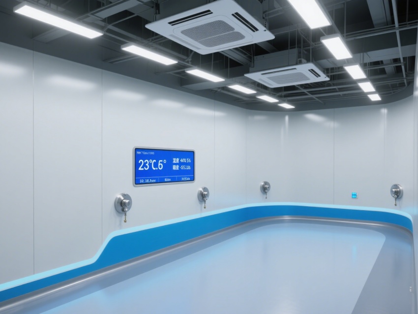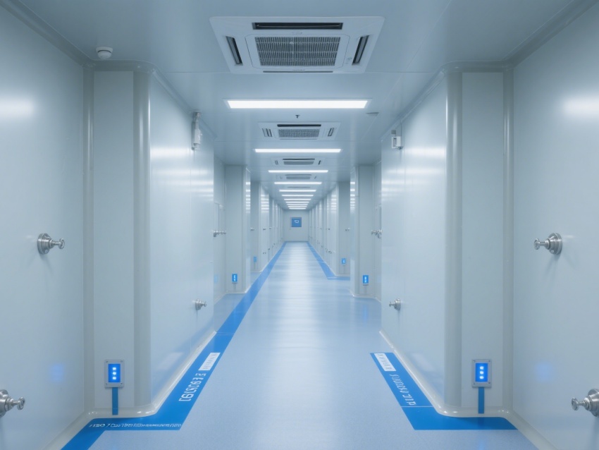 走廊采用一體化潔凈設(shè)計(jì),地面藍(lán)色標(biāo)識(shí)線清晰規(guī)劃動(dòng)線,各類管線與設(shè)備布局兼顧功能性與美觀性。整體工程通過(guò)材質(zhì)選用、空氣凈化、智能監(jiān)控的協(xié)同,為芯片檢測(cè)提供了超潔凈、高穩(wěn)定的專業(yè)環(huán)境,有力保障芯片檢測(cè)的精度與可靠性,是芯片研發(fā)與質(zhì)量把控的核心技術(shù)支撐單元。