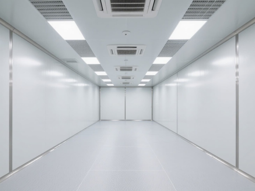 車間以白色抗菌彩鋼板為主體建材,搭配淺灰防靜電地坪,墻面與地面的圓弧過渡設計消除衛生死角,便于徹底清潔消毒。頂部嵌入式高效送風口形成垂直層流,配合側下回風系統,實現每小時15-25次的空氣置換,持續維持潔凈正壓。?